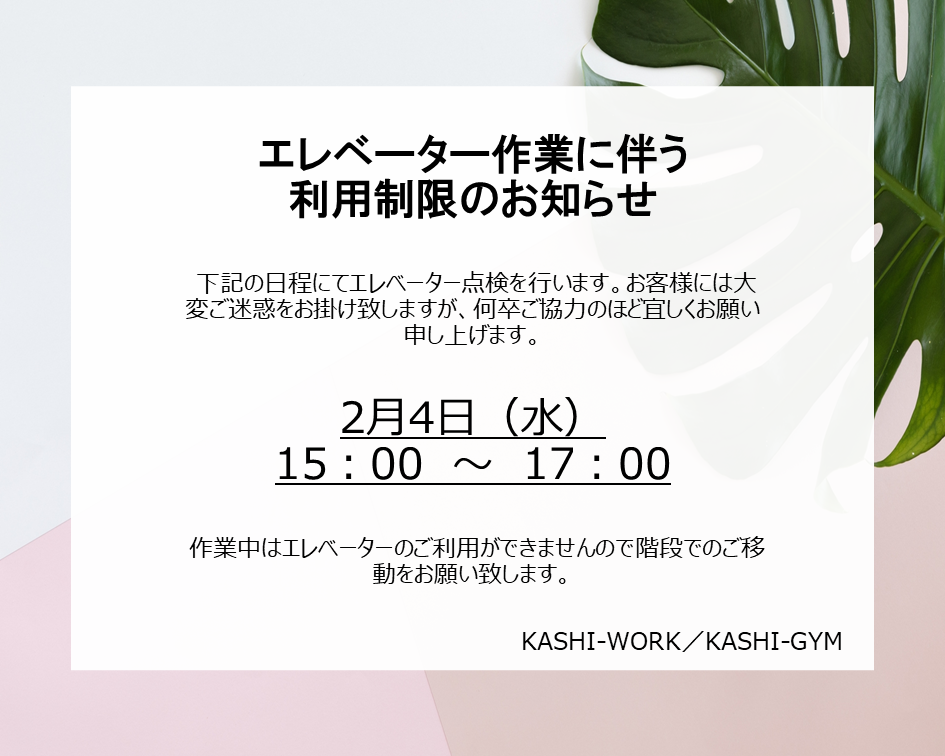 2月4日(水)15:00~17:00※時間内に1時間ほど作業中はエレベーターのご利用ができませんので階段でのご移動をお願いいたします。